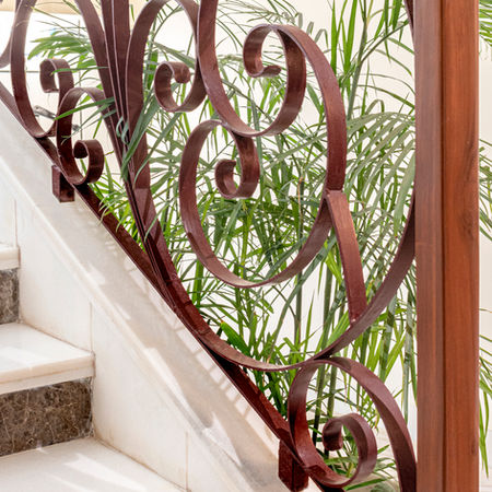Indian white marble was used on the staircase tread with the staircase riser clad in a grey stone. We used a floral metal railing to add some lightness and movement to the space and added polished teak wood handrails to tie the space together. The dominant color of the home was white to make the space feel as open and airy as possible in the natural sunlight.We added plenty of plants to every corner of the home to add some warmth to the space.