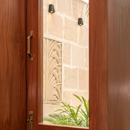 We designed this home to function for a multi-generational family. As this property was open on three sides, we wanted to optimize natural light that was readily available. The home was made up of interconnected spaces with a courtyard in the middle for ventilation and sunlight. We used Dholpur stone and polished teak wood to highlight the architectural details with a special focus on incorporating natural materials and greenery. Subtle yet statement indoor and outdoor lighting by Tivsa added to the warm underones of this home.